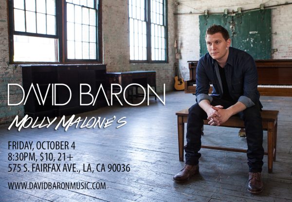 On Friday, October 4, singer-songwriter David Baron will take the stage for a full-band show at Molly Malone’s in Los Angeles. The show will feature performances of songs from Baron’s latest full-length album of all original material, Heartbeat, as well as old favorites.